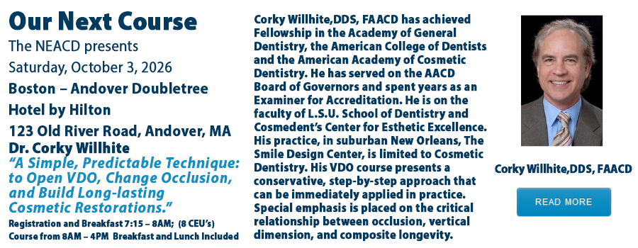 Welcome to our website! As the President of the New England Academy of Cosmetic Dentistry, I am very pleased that you have taken the time to check us out! The NEACD, a local affiliate of the American Academy of Cosmetic Dentistry, is a valuable resource for dentists and patients from the states of Connecticut, Massachusetts, Rhode Island, Maine, New Hampshire, and Vermont. For the thousands of dentists in the New England area who are looking to improve their knowledge and skills in the ever changing and expanding world of cosmetic dentistry, we are here to help.